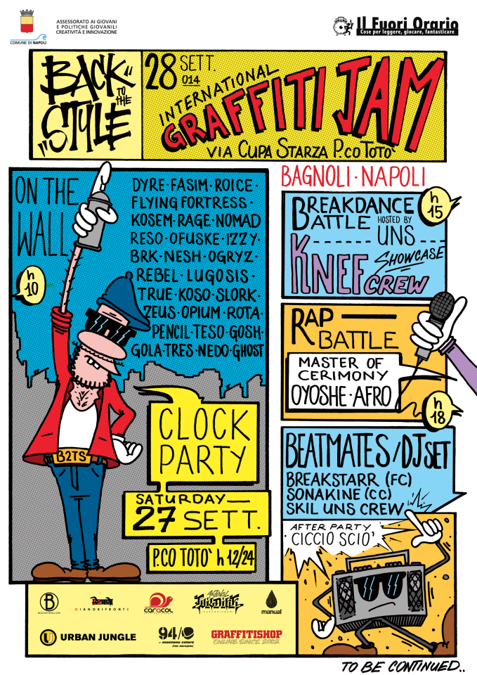 27\28 settembre 2014 - via Cupa Starza, P.co Totò Bagnoli, Napoli Evento promosso da Comune di Napoli, Assessorato alle Politiche Giovanili, Creatività e Innovazione e il Fuori Orario Cooperativa Sociale a.r.l. in collaborazione con le associazioni Caracol, Napolipedala, Giano Bifronte, Bereshit e il Centro Giovani del Comune di Napoli "Peppino Impastato". Programma Sabato 27 ore 10 - 20 - P.co Totò - area ristoro e giochi Clock party ovvero la festa de Il Fuori Orario con attività per bambini e adulti, nel parco Totò. Al tramonto avremo l'onore di ospitare il maestro Salvatore Gatto con lo spettacolo di Guarattelle "Pulcinella 500 anni portati bene". Laboratori e attività in collaborazione con l'associazione Caracol, Napolipedala. Domenica 28 ore 10 - 24 - Via Cupa Starza, P.co Totò Back to the Style - Graffiti jam con guest Internazionali ore 10.00 Graffiti ore 15.00 Musica e breakdance (fronte Università Ingegneria) ore 18.00 Battle di Rap freestyle ore 21.00 Chiusura musicale con la selezione in vinile di Ciccio Sciò ( ska\rocksteady) Evento in collaborazione con l'associazione Bereshit e Giano Bifronte. |
