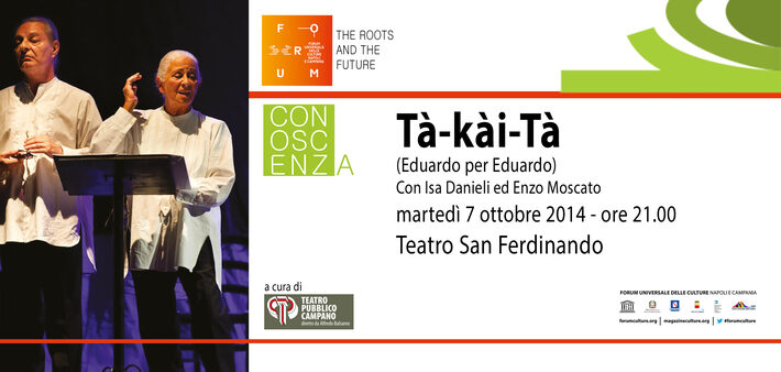 L'Assessorato alla Cultura e al Turismo e la Fondazione Forum Universale delle Culture, nell'ambito delle iniziative in ricordo di Eduardo De Filippo a trent'anni dalla morte, presentano, nel suo teatro San Ferdinando, un viaggio immaginario, fantastico, intorno ai pensieri e ai sentimenti di Eduardo De Filippo. Tà-kài-Tà -- Questo e Quello in greco antico, l'unico lavoro "su" (e non "da") Eduardo.