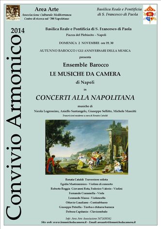 Il concerto vedrà protagonista l'Ensemble Barocco "Le Musiche Da Camera" di Napoli che accompagnerà la flautista Renata Cataldi nell'esecuzione di tre rari concerti per Traversiere ed archi di autori della scuola napoletana del '700: Nicola Logroscino, Aniello Santangelo e Giuseppe Sellitto. Nicola Logroscino, il "dio dell'opera buffa" per usare le parole del grande storico della musica napoletana Ulisse Prota-Giurleo, è conosciuto soprattutto per il contributo considerevole che diede ai generi dell'opera comica. Anche Giuseppe Sellitto fu attivo per quasi tutta la sua esistenza nella città natale, ad eccezione di alcuni brevi periodi. Nominato organista nella Chiesa di San Giacomo degli Spagnuoli di Napoli, fu anche lui molto attivo come compositore di opere buffe. Di Aniello Santangelo si conosce ben poco, e solo grazie a recenti indagini di archivio condotte da Gian Giacomo Stiffoni. Questi concerti fanno parte di un lavoro di ricerca che Renata Cataldi svolge da anni sul repertorio flautistico in aria napoletana e sono stati recentemente registrati, con l'Ensemble Le Musiche da Camera, per l'etichetta internazionale DYNAMIC in un cd dal titolo emblematico "Si suona a Napoli" . www.dynamic.it.