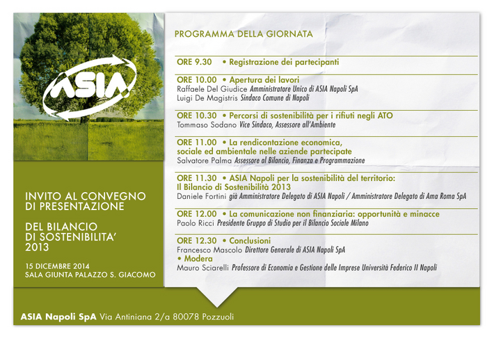 Lunedì 15 dicembre a partire dalle ore 9.30 ASIA presenterà, nella Sala Giunta di Palazzo San Giacomo, il Bilancio di Sostenibilità 2013, |
