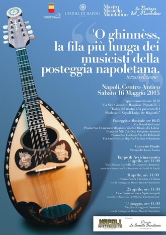 Per la terza edizione di "'O ghinnèss" infatti, già si sono prenotati centinaia di mandolinisti, chitarristi, cantanti, "maschere" dei personaggi della Commedia Napoletana ed ancora virtuosi della tammorra e gli immancabili artisti delle guarattelle che, tutti insieme e provenienti anche da altre regioni italiane - qualcuno persino dall'estero - percorreranno le strade del Centro Antico di Napoli per rinnovare l'omaggio ormai divenuto un appuntamento fisso, alla Città del bel canto e dell'Accoglienza.