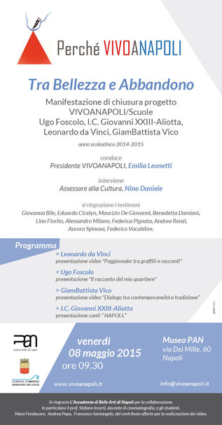 VIVOANAPOLI chiude con una manifestazione al PAN,venerdì 8 maggio, ore 9.30, il progetto "Perché VIVOANAPOLI. Tra Bellezza e Abbandono" realizzato con quattro scuole di Napoli.
