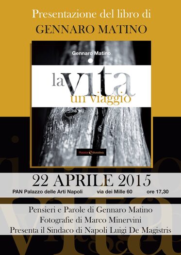 Mercoledì 22 aprile alle ore 17.30, presso il Palazzo delle Arti di Napoli (Sala Convegni piano 3), in via Dei Mille n. 60, si presenta il nuovo libro di Gennaro Matino, "La vita: un viaggio", edito da Passione Educativa, un percorso di pensieri e parole sul significato vero e profondo della vita, supportato dalle evocative immagini di un giovane fotografo partenopeo, Marco Minervini, che provano a dare corpo ai pensieri dell'autore, animando quelli del lettore.