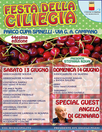 Arriva alla quarantaquattresima edizione la "Festa della Ciliegia" a Chiaiano, storica kermesse che si terrà nel weekend,sabato 13 e domenica 14 giugno, nel quartiere nell'Area Nord di Napoli, patrocinata dall' VIII Municipalità. Oltre alle degustazioni, l'evento dedicherà anche ampio spazio alla musica. Tra gli altri si esibiranno i Tarumbò, che guidati da Paolo Catapano e da Mario Montella, emozioneranno i presenti ricordando l'indimenticabile Pino Daniele. Special Guest Angelo di Gennaro. |