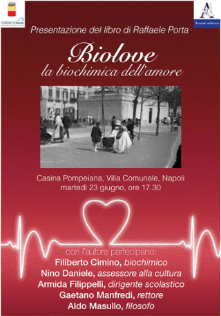 Martedì 23 giugno, alle ore 17.30, nella Casina Pompeiana in Villa Comunale sarà presentato "Biolove, la biochimica dell'amore", l'ultimo libro di Raffaele Porta, scrittore, oltre che scienziato, professore ordinario di Biochimica "Federico II". All'incontro parteciperanno, con l'autore, l'Assessore alla Cultura e al Turismo Nino Daniele, Filiberto Cimino, biochimico, Armida Filippelli, dirigente scolastico, il Rettore della Federico II Gaetano Manfredi ed il filosofo Aldo Masullo. |