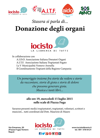 Nell'ambito delle iniziative promosse da questa municipalità per il periodo estivo il 15 luglio p.v. alle ore 19.00 si terrà un evento sulla scalinata di Piazza Fuga organizzato dalla libreria IO CI STO e l'AIDO.