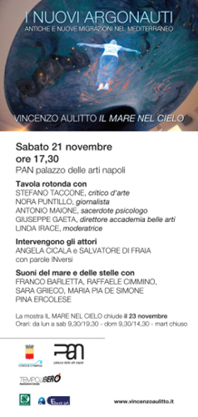 Tavola rotonda con Stefano Taccone, critico d'arte Nora Puntillo, giornalista Antonio Maione, sacerdote- psicologo Giuseppe Gaeta, direttore Accademia Belle Arti Napoli Linda Irace, moderatrice Contributo letterario di Salvatore Di Fraia e Angela Cicala Suoni del mare e delle stelle con Franco Barletta, Raffaele Cimmino, Sara Grieco, Maria Pia De Simone, Pina Ercolese |