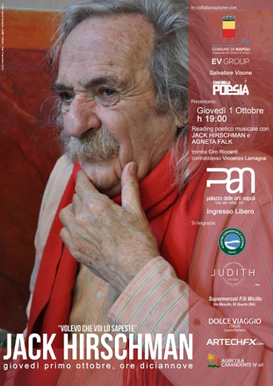 Jack Hirschman è il massimo esponente della contro cultura americana, Il poeta rosso, corsaro ed eretico, eterno lottatore contro le ingiustizie sociali, attivista del pacifismo mondiale e da sempre contro ogni forma di razzismo e fascismo, giovedì si esibirà con Agneta Falk sua moglie, anche lei scrittrice e pittrice.