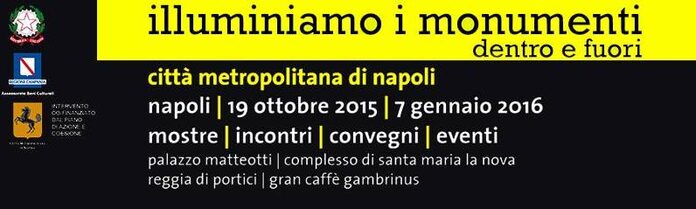 È con la manifestazione illuminiamo i monumenti dentro e fuori che la Città Metropolitana di Napoli accende d'arte i suoi luoghi storici: dal 19 ottobre 2015 al 7 gennaio 2016. Palazzo Matteotti, la Reggia di Portici, il Complesso di Santa Maria la Nova e il Gran Caffè Gambrinus si illuminano metaforicamente, animati da un ricco programma di iniziative culturali - mostre, seminari e convegni - che consentirà di scoprire alcune delle sedi di maggior pregio della Città Metropolitana di Napoli. Maggiori informazioni: www.illuminiamoimonumenti.it Pagina Facebook |