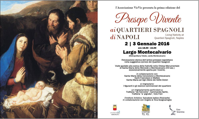 L'evento è patrocinato dalla Municipalità 2 ed a cura dell'Associazione Vic Vic che metterà in scena il primo Presepe Vivente da materiali riciclati, ai Quartieri Spagnoli (Largo Montecalvario, uscita Montecalvario Metro Toledo).