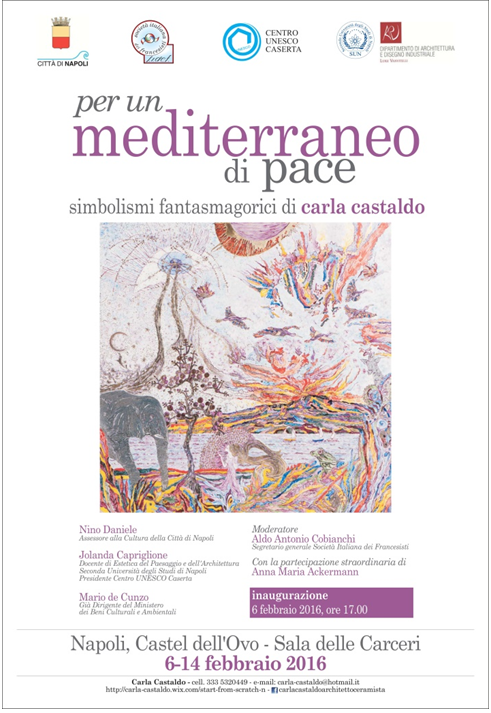 Carla Castaldo, artista napoletana, dopo numerose esposizioni in Italia e all'estero che l'hanno vista protagonista in sedi museali ed edifici prestigiosi di città quali Montecarlo, Piacenza, Venezia, Torino, Londra, Milano, Camogli, Bologna, Berlino, Bruges, Roma, Dubai, approda a Napoli a Castel dell'Ovo, spazio espositivo di grande prestigio e fascino, dal 6 al 14 febbraio 2016 con la mostra Per un Mediterraneo di pace. Simbolismi fantasmagorici di Carla Castaldo, curata e organizzata da Aldo Antonio Cobianchi. Si tratta per l'artista di una tappa molto importante perché è qui, nella sua città, che intende parlare del Mediterraneo come mare di speranza e di vita. La mostra - sotto l'egida dell'Assessorato alla Cultura della Città di Napoli, il patrocinio morale della Società Italiana dei Francesisti S.I.DE.F. e del Centro Unesco Caserta, la collaborazione degli studenti della Cattedra di Culture materiali del Mediterraneo del Dipartimento di Architettura e Disegno Industriale della SUN - non vuole essere un messaggio utopico, ma una sollecitazione rivolta ai visitatori perché si liberino dai vincoli dell'indifferenza e dell'apatia e intraprendano la personale, piccola marcia per la pace, ciascuno secondo le proprie capacità e possibilità. Carla Castaldo affida il suo messaggio all'arte, come linguaggio universale, dipingendo su piastre di porcellana, con una personale reinterpretazione dell'antica tecnica della "decorazione a terzo fuoco". Attraverso le linee e le stesure cromatiche esprime il proprio universo emozionale e conduce l'osservatore in mondi fantastici, liberi da vincoli spazio-temporali e dal predominio della ragione, parlando di pace, condivisione e speranza: oltre il buio c'è la luce, che può essere trovata solo se la si cerca con determinazione. La mostra trova la sua sede ideale nelle Carceri di Castel dell'Ovo, spazio misterioso e magico che invita alla riflessione. Il tufo a vista delle pareti e delle coperture a volta, l'assenza di finestre e la presenza lungo le pareti di tre varchi chiusi da cancelli verso il buio - non soltanto fisico - comunicano sopraffazione e sofferenza: è questo, quindi, il luogo adatto per accompagnare il visitatore in un viaggio introspettivo alla ricerca del proprio sé. L'allestimento con materiali umili vuole sottolineare che in questa società dell'apparire, degli sprechi e della volgarità esistono percorsi alternativi per ritrovare il senso del bello e del buono, che abbiamo smarrito, e dialogare con semplicità di pace, uguaglianza e rispetto per la natura e gli animali. Un grande uccello con sottili piume dorate, sulla grata posta di fronte all'ingresso, vuole essere il simbolo di libertà e di gioia contro il quotidiano della nostra epoca, oggettivamente drammatica.