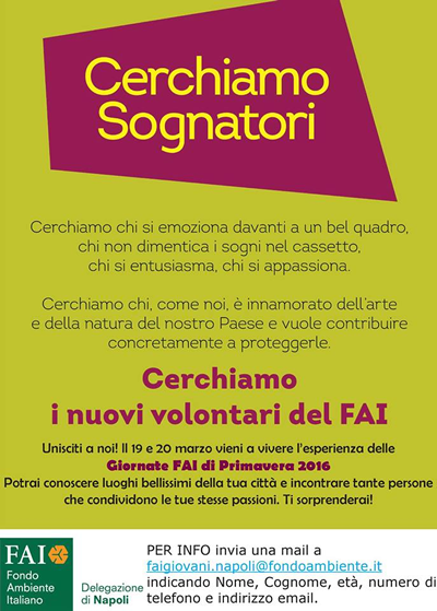Per dare la propria disponibilità, basta inviare a faigiovani.napoli@fondoambiente.it, entro il 28 febbraio, NOME, COGNOME, ETA', NUMERO DI TELEFONO ed INDIRIZZO E-MAIL.