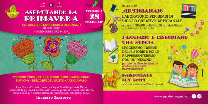 Domenica 28 febbraio all'ippodromo di Agnano ingresso gratuito dalle ore 10.30 con tante iniziative per la famiglia organizzate nel parco. Si comincia con l'artigianato e le attività manuali con il laboratorio di riciclo creativo a cura di Skabb collettivo Skartabbelliamo; "leggiamo e disegniamo una storia" per raccontare e rappresentare su carta le parole e costruire una baby biblioteca; passeggiate gratuite su pony per un giretto in sella nei giardini dell'ippodromo, parco giochi con trenino tour e accesso al parco con bici, pattini, monopattini e pallone per consentire ai più piccoli di giocare all'aperto liberi e sicuri. Per ulteriori informazioni visitare la pagina dell'Ippodromo di Agnano. |