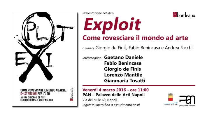 Dopo le presentazioni romane tenutesi nei prestigiosi spazi del MACRO - Museo d'Arte contemporanea di Roma e del Museo Carlo Bilotti di Villa Borghese, siamo lieti di proseguire il viaggio di Exploit. Come rovesciare il mondo ad arte facendo tappa al PAN - Palazzo delle Arti Napoli dove, nella splendida cornice del settecentesco Palazzo Roccella, alla presenza dell'Assessore alla Cultura Gaetano Daniele, si terrà venerdì 4 marzo alle ore 11.00 la presentazione del libro curato da Giorgio de Finis, Fabio Benincasa e Andrea Facchi. Exploit è un libro volutamente impossibile, sorprendente, labirintico, bulimico. Con 1104 pagine, raccoglie più di 100 interventi di artisti, critici e intellettuali, da Hakim Bey a Mario Perniola da Chantal Mouffe a Michelangelo Pistoletto, da Michel Onfray a Pablo Echaurren, animando un crocevia di idee e pratiche artistiche, di riflessioni politiche, di urgenze espressive. Un cortile comunitario dove gli echi delle voci dei singoli, senza essere coro, diventano discussione collettiva, momento di scoperta o di ri-scoperta di idee al tempo stesso familiari ed esotiche. |