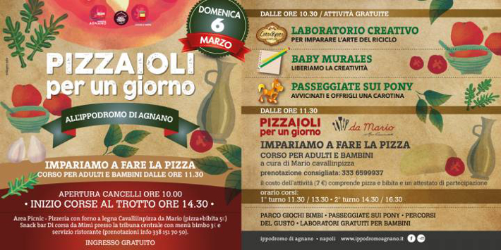 Domenica 6 marzo all'ippodromo di Agnano ingresso gratuito dalle ore 10.30 con tante attività per la famiglia organizzate nel parco. A cominciare da "pizzaioli per un giorno", corso per adulti e bambini per imparare a fare la pizza organizzato in due turni (ore 11.30/13.30 e ore 14.30/16.30). Come sempre in programma anche l'artigianato e le attività manuali con il laboratorio di riciclo creativo "creo e ricreo" per realizzare manufatti con il tema della festa della donna; e ancora colori e gioco con "happy color baby murales" per liberare la creatività dei piccoli attraverso tanti colori da disegnare su grandi pannelli; passeggiate gratuite su pony per un giretto in sella nei giardini dell'ippodromo e offrire loro una carotina; parco giochi con trenino tour e accesso al parco con bici, pattini, monopattini e pallone per consentire ai più piccoli di giocare all'aperto liberi e sicuri. |