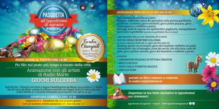 Lunedì 28 marzo la lunga giornata di pasquetta all'ippodromo di Agnano a partire dalle ore 10.30(adulti euro 2, bambini gratis) con un ricco programma di attività e giochi per tutta la famiglia. A cominciare dal palco Radio Marte con spettacolo di musica e intrattenimento con gli artisti e gli speaker di punta dell'emittente. Chi ama la natura avrà a disposizione l'accesso al prato più lungo e curato della città dove consumare la tradizionale colazione al sacco e giocare all'aria aperta con frisbee, palloni ed aquiloni. E ancora, animazione dalle ore 12.00 alle ore 16.00 (2 euro bambino): per bimbi fino ai 4 anni di età, tendone multicolor, pesca dei pesciolini nella piscina gonfiabile, giochi e staffette a premi, tatuaggi, bolle di sapone e pagliacci, manipolazione di palloncini e gonfiabile; per bimbi da 4 a 11 anni, giochi senza frontiere sull'erba (4 turni ore 12.00/16.00), gioco del bowling, del barattolo e del fazzoletto, staffetta a premi, tiro al bersaglio, corsa dei sacchi, tiro alla fune, coda del gallo e la tradizionale pignatta con tante caramelle per tutti. Laboratori creativi con il tema della pasqua. Come sempre passeggiate su pony per un giretto in sella nei giardini dell'ippodromo (1 euro bambino), parco giochi e accesso in ippodromo con bici, pattini, monopattini e pallone per consentire ai bambini di giocare all'aperto liberi e sicuri.
