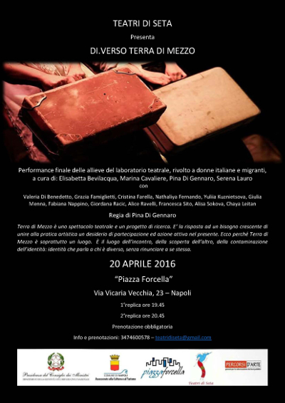 Performance finale delle allieve del laboratorio teatrale, rivolto a donne italiane e migranti, a cura di: Elisabetta Bevilacqua, Marina Cavaliere, Pina Di Gennaro, Serena Lauro con Valeria Di Benedetto, Grazia Famiglietti, Cristina Farella, Nathaliya Fernando, Yuliia Kuznietsova, Giulia Menna, Fabiana Nappino, Giordana Racic, Alice Ravelli, Francesca Sito, Alisa Sokova, Chaya Leitan.