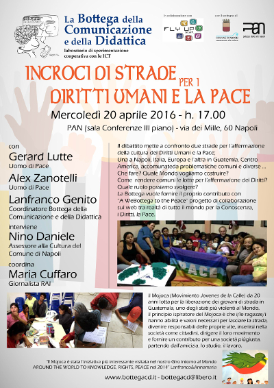 Il dibattito illustra e mette a confronto due strade per l'affermazione della cultura dei Diritti Umani e la Pace; una a Napoli, Italia, Europa e l'altra in Guatemala, Centro America, accomunate da problematiche comuni e diverse...