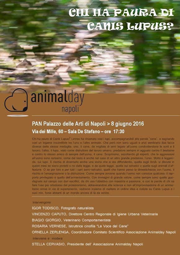 Introduce e modera Ornella Zerlenga, Coordinatore Comitato Scientifico Associazione Animal Day Napoli. Intervengono Rosaria Vernese - Istruttrice cinofila "La Voce del Cane", Biagio Giorgio - veterinario comportamentista, Vincenzo Caputo - Direttore Centro Regionale di Igiene Urbana Veterinaria, Igor Todisco - fotografo naturalista, Stella Cervasio - Presidente dell'Associazione Animal Day Napoli.