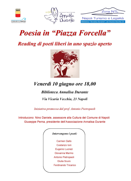 Venerdi 10 giugno alle ore 18.00 si terrà nello Spazio Comunale Piazza Forcella un "Reading" di poesie, su iniziativa del poeta prof. Antonio Pietropaoli e dell'Associazione Annalisa Durante.