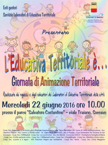 L'iniziativa nasce nell'ambito delle attività dei laboratori di Educativa Territoriale e si pone come tappa di un percorso di eventi di Animazione Territoriale, che si rivolge prevalentemente a gruppi informali di adolescenti che si incontrano in luoghi naturali di ritrovo come piazze, giardini, ecc. Essa rappresenta una modalità per coinvolgere e rendere protagonisti i giovani e gli adolescenti al fine di promuovere e rinforzare i fattori protettivi e le risorse, che naturalmente sono presenti nei gruppi naturali di aggregazione. Il percorso di eventi Animazione Territoriale si compone di quattro appuntamenti di cui quello dell'Area Nord rappresenta il primo. L'area interessata sarà attrezzata con stand, che vedranno gli Enti gestori dei diversi Laboratori di Educativa territoriale presenti sul territorio organizzare attività laboratoriali rivolte ai giovani partecipanti (ballo, canto, laboratori creativi ecc.) |