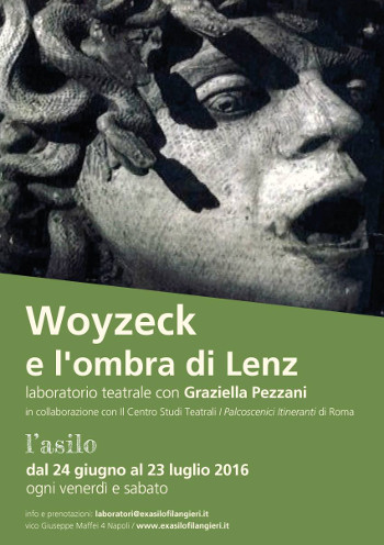 Quanto al resto: il testo, la musica, la scenografia e i costumi minimi ed essenziali, da costruire insieme, devono andare ad abitare il corpo dell'attore. Il laboratorio prevede un allenamento intensivo sul corpo - voce al fine di fornire gli strumenti tecnici e di conoscenza necessari per affrontare il tessuto drammaturgico "dentro" e "fuori" dal testo. Il lavoro tende a stimolare ed a portare alla luce le potenzialità espressive, che l'attore spesso nasconde e reprime sotto qualcosa di già codificato. Questo progetto vuole affrontare un Teatro Nuovo Visionario, accettando la sfida di far fermentare il territorio attraverso dei laboratori da vivere non come corpo separato, ma come luogo ricco di tensioni vitali, spazio di incroci, organismo vivente che respira assieme alla città. Quando Il laboratorio si svolgerà dal 24 giugno al 23 luglio 2016 Ogni venerdì dalle ore 16:30 alle ore 19:30 Ogni sabato dalle ore 11:00 alle ore 14:00 Come partecipare http://www.exasilofilangieri.it/woyzeck-e-lombra-di-lenz-laboratorio/ c/o l'Asilo Vico Giuseppe Maffei 4, 80138 Napoli |