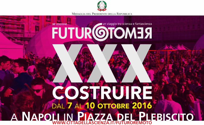 La XXX edizione di Futuro Remoto ha come per titolo "COSTRUIRE" ed è promossa dalla Fondazione Idis - Città della Scienza, dall'Università degli Studi di Napoli Federico II e dall'Ufficio Scolastico Regionale per la Campania, dalla Regione Campania, dal Comune di Napoli in partnership con la Seconda Università degli Studi di Napoli, l'Università degli Studi di Napoli l'Orientale, l'Università degli Studi di Salerno, il Centro Italiano Ricerche Aerospaziali e in collaborazione con tutte le altre Università della Regione Campania, i centri di ricerca, le istituzioni e fondazioni culturali, il mondo delle imprese e del lavoro. Quest'anno, dopo il successo dell'ultima edizione che ha registrato più di 150.000 visitatori, Futuro Remoto vuole riaffermare il suo carattere di vera e propria "Festa della Scienza". IL VILLAGGIO DELLA SCIENZA 2016 Il cuore di Futuro Remoto è il Villaggio della Scienza di Piazza del Plebiscito dove si prevede la partecipazione di un pubblico ancora più numeroso di quello dell'anno scorso. Il Villaggio della Scienza è ancora più grande e articolato: 9 le isole tematiche (ciascuna con responsabili scientifici di fama nazionale e internazionale) con allestimenti di oltre 6.000 mq che prevedono il coinvolgimento del Palazzo Reale, del Circolo Ufficiali dell'Esercito, del Circolo Ufficiali della Marina Militare, del Circolo artistico Politecnico, del Caffè Gambrinus. LE ATTIVITÀ DI FUTURO REMOTO Tutte le attività sono hands on, basate sull'interattività e sulla possibilità per i visitatori di toccare "con mano" i fenomeni scientifici e di scoprire le frontiere della ricerca scientifica, filosofia alla base del successo di Città della Scienza e dei science centre di tutto il mondo. |