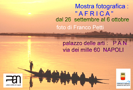 Dal 26 Settembre 2016 sarà aperta al pubblico la mostra Franco Petti. Fotografie dell'Africa presso la Galleria Pan (Palazzo delle Arti) di Napoli. L'esposizione, promossa e prodotta dal Comune di Napoli, curata dall'Uffcio Stampa Giuseppe De Pietro in collaborazione con l'Archivio De Pietro Press, sarà presentata nell'ambito di Conoscere l'Africa, un progetto della De Pietro Press Communication di Roma. Resterà aperta fino al 6 ottobre.