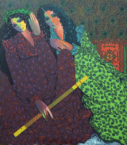 Vedremo esposti i suoi ritratti: di profilo o frontali, con sfondi geometrizzanti, strumenti musicali e gioielli della tradizione berbera e beduina, dove Houamel si riappropria dell'identità algerina che era stata violata e sottomessa dai colonizzatori. L'artista islamico non può sostituirsi a Dio nella creazione dell'individuo, il soffio creatore appartiene solo a Lui, ma con la sua capacità e sensibilità umana può creare forme, ed è così che nasce la grande arte nella consapevolezza dell'autore di non poter raggiungere i vertici dell'immaginazione e della fantasia divina; in questa tensione, la sublimazione dell'opera veicola il sentimento del divino, e l'arte islamica diventa puro colore e forma, catartica interiorità. Così appaiono i "Giardini del Paradiso" davanti ad i nostri occhi. Houamel ci conduce nei suoi "Giardini": la matematica e la filosofia greca entrano in contatto col mondo musulmano. La spirale delle opere esposte visualizza perfettamente il rapporto che passa tra Dio e l'uomo nell'Islam, con i suoi cerchi concentrici parte da Dio ed arriva all'uomo, e all'uomo spetta ripercorrere il tragitto inverso, in un indiarsi continuo. Nei primi "Giardini del Paradiso" compaiono le farfalle, che pian piano vanno scomparendo; la farfalla è simbolo della trasformazione: così da un linguaggio più reale e figurativo, l'artista si stacca ed alchemicamente si trasforma in un messaggero tra noi e l'infinita, irraggiungibile, inimmaginabile bellezza del Paradiso. Il Paradiso non è concepibile da mente umana, ma proprio nella sua spossante ed inesauribile ricerca, proprio allora l'uomo e l'artista, ne conquistano un riflesso. In ogni giardino ed in ogni Paradiso possiamo trovare l'Albero della Vita e l'Albero della Conoscenza, quell'Albero Cosmico e Sacro che unisce la terra ed il cielo e che collega tutte le forme della Natura tra loro: Houamel ci invita così ad esplorare i suoi "Giardini del Paradiso", luoghi incantati che esortano l'osservatore a staccarsi dal limite temporale e ad immergersi in una ritmica contemplazione mistica, in un raccoglimento tutto interiore. La tecnica dei "Giardini" è l'acquarello, controllato con grande perizia: i giardini non possono fiorire senza la presenza dell'acqua, che deve essere canalizzata e regolata. E' nei Giardini del Paradiso che Abdelkader Houamel diventa un artista universale.