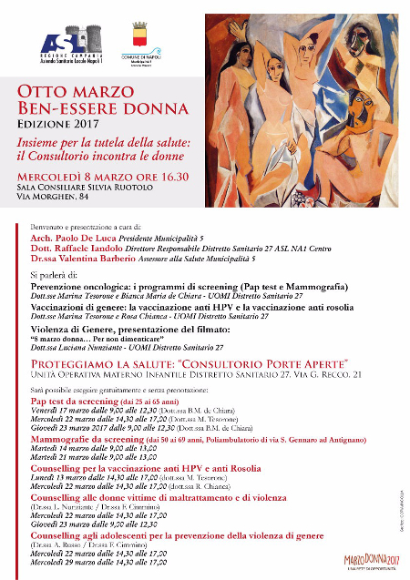 Durante l'incontro saranno indicate delle date, durante il mese di Marzo, in cui sarà possibile effettuare gratuitamente e senza bisogno di prenotazione, presso l'Unità Materno - Infantile del Distretto Sanitario 27 dell'Asl Napoli 1 Centro sita in via G. Recco, 21, pap  test e mammografie ed usufruire di un servizio di Counseling per vaccinazion Hpv e Anti Rosolia oltre che Counseling dedicato alle donne vittime di maltrattamento e agli adolescenti per la prevenzione della violenza di genere.