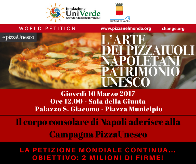 L'Assessore alle Attività Produttive del Comune di Napoli, Enrico Panini, e il Presidente dell'Associazione Univerde Pecoraro Scanio, celebrano l'arte dei pizzaioli Napoletani e continuano a sostenere attivamente la petizione #PizzaUnesco. Il giorno giovedì 16 marzo 2017, alle ore 12.00 presso la Sala della Giunta del Comune, il corpo consolare di Napoli manifesterà la propria partecipazione all'iniziativa aderendo ufficialmente alla petizione, che ad oggi conta più di un milione e trecento mila firma provenienti da oltre 50 paesi del mondo e che punta al raggiungimento della vetta di 2 milioni di firme. La candidatura dell'Arte dei Pizzaioli Napoletani come Patrimonio Immateriale dell'Umanità, avanzata dalla Repubblica Italiana, è giunta ormai all'anno della decisione finale: il verdetto della Commissione UNESCO del prossimo dicembre a Seoul è, quindi, alle porte. Finalmente un'arte che per tradizione appartiene al nostro territorio, potrà essere in questo modo riconosciuta al mondo intero come unica e irripetibile. |