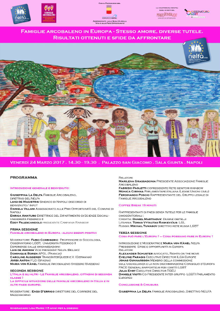 L'Italia ponte tra i Paesi con pieni diritti e l'est europeo. Politici, avvocati e associazioni a confronto Cirinnà, Viotti e l'avvocato di Trento Schuster tra i relatori Napoli - Il 24 marzo a Napoli, a Palazzo San Giacomo sala Giunta, si terrà dalle 14.30 alle 19.30 una giornata di discussione che coinvolgerà avvocati, politici e attivisti impegnati sul fronte dei diritti delle famiglie arcobaleno in tutta Europa. "L'Italia sta cambiando a colpi di sentenze della magistratura, i Paesi occidentali indicano la strada dei pieni diritti mentre quelli dell'Est Europa spesso lottano anche per avere riconoscimenti minimi - spiega Giuseppina La Delfa, membro del direttivo di Nelfa (Network of European LGBTIQ* Families Associations - Sarà un giorno importante di confronto, convinti come siamo che esista un'Europa dei diritti che va fatta crescere e sostenuta, soprattutto oggi in questo momento di crisi. "La città di Napoli ha accelerato con determinazione e coraggio il processo - tanto inevitabile quanto giusto - di affermazione, esercizio e tutela dei diritti di genere, sessuali e riproduttivi. Siamo orgogliosi di ospitare la conferenza europea delle famiglie omogenitoriali.", ha dichiarato Daniela Villani, Assessora alla Qualità della Vita e alle Pari Opportunità. Interverranno avvocati, attivisti e politici di: Italia, Belgio, Francia, Germania, Svizzera, Spagna, Croazia, Lituania, Svizzera. Tra gli altri, sarà presente Monica Cirinnà, prima firmataria della legge sulle unioni civili, l'europarlamentare Daniele Viotti, il sindaco Luigi De Magistris e Alexander Schuster, l'avvocato della coppia gay di Trento che hanno recentemente ottenuto il pieno riconoscimento della paternità dei due loro figli nati da Gestazione per altri in Canada. In allegato il programma completo. La giornata è organizzata da Nelfa e Famiglie Arcobaleno, con il patrocinio del Comune di Napoli e il sostegno dell'Osservatorio LGBT della Federico II. Per info: Giuseppina La Delfa - 3933963733 Ufficio stampa Samuele Cafasso Founder and former president of Famiglie Arcobaleno (rainbow families Italy) www.famigliearcobaleno.it Board member of NELFA (Network of European LGBTIQ* Families Associations) - www.nelfa.org - www.internationalfamilyequalityday.org - www.lgbt-families.eu/ |
