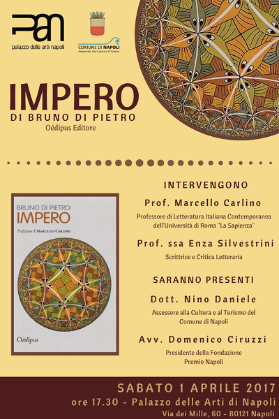 Sabato 1 aprile 2017 al Palazzo delle Arti di Napoli, alle ore 17.30 in collaborazione con l'Assessorato al Turismo e alla Cultura di Napoli, sarà presentato il libro "Impero" Edizioni Oèdipus