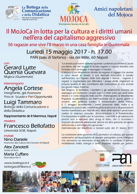La strada può essere violenta quando i poliziotti picchiano e i sicari uccidono, ma nei Gruppi di Strada ragazze e ragazzi trovano una famiglia che li protegge, li appoggia, li rispetta. Il Mojoca è un Movimento diretto da ragazze e ragazzi che vivono o sono vissuti in strada; il suo metodo educativo è basato sull'Amicizia, nel rispetto della loro dignità e libertà .... ragazze e ragazzi si organizzano per difendere i propri diritti, migliorare la propria qualità di vita, contribuire alla costruzione di una società più giusta, equa, fraterna. Nel Mojoca, le bambine, i bambini e gli adolescenti trovano un appoggio per realizzare i propri sogni e molti sono già usciti dalla strada e si sono integrati nella società. Partecipiamo al Movimento Popolare Guatemalteco ed Internazionale ed in questi giorni ci uniamo alla protesta contro il femminicidio dell'8 marzo.