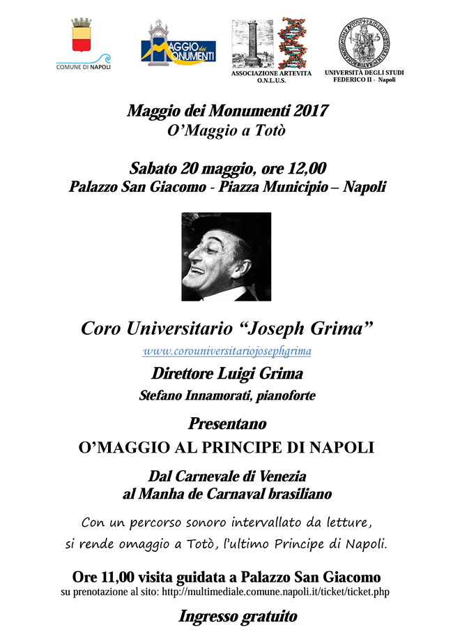 A seguire, alle ore 12.00, nell'androne principale del Palazzo, prospiciente la Piazza Municipio il  Coro Universitario "Joseph Grima" diretto dal Maestro Luigi Grima, si esibirà con un evento-concerto dal titolo O'MAGGIO AL PRINCIPE DI NAPOLI. Un percorso sonoro intervallato da letture che rende omaggio a Totò, "l'ultimo Principe di Napoli" Il Coro Universitario "Joseph Grima" sarà accompagnato al pianoforte da Stefano Innamorati.