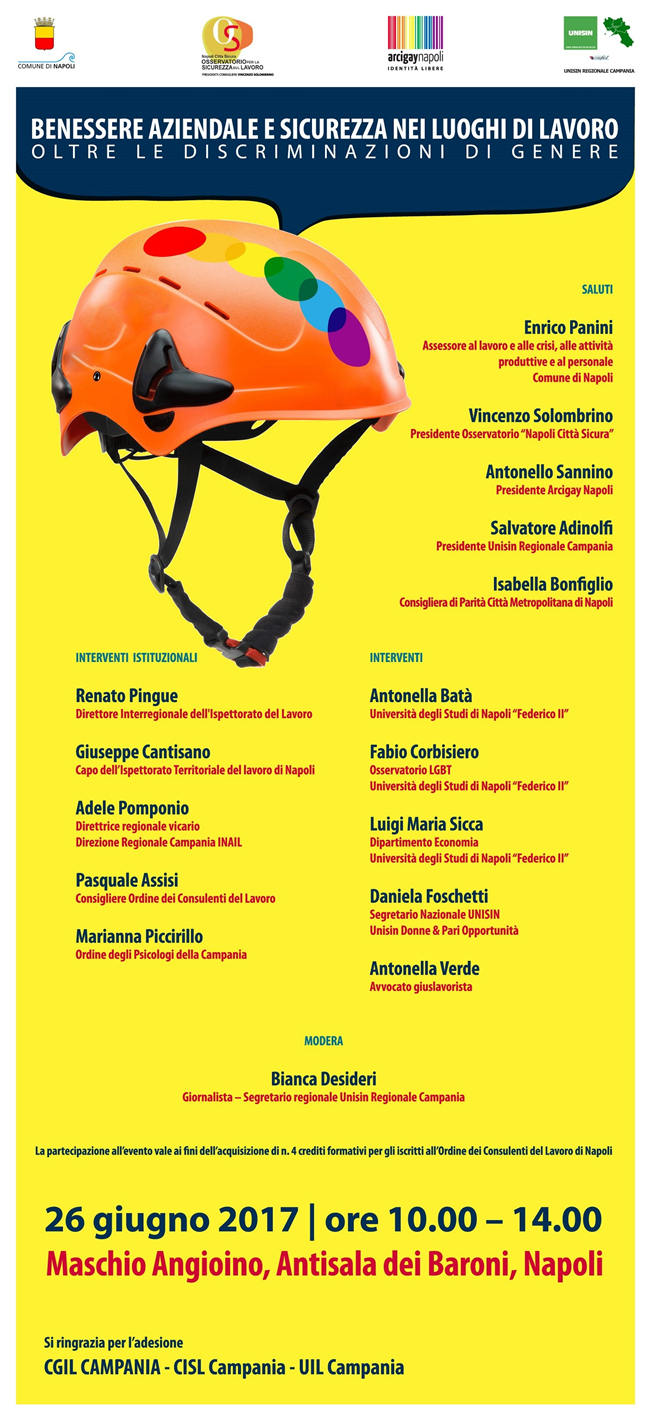 L'Osservatorio Sicurezza sui Luoghi di Lavoro incollaborazione con i Partners  UNISIN Regionale Campania e Arcigay terrà una tavola Rotonda sul tema "Benessere aziendale e sicurezza nei luoghi di lavoro, oltre le discriminazioni di genere", il giorno 26 giugno 2017 dalle ore 10.00 alle ore 14.00 presso l'Antisala dei Baroni del Maschio Angioino.