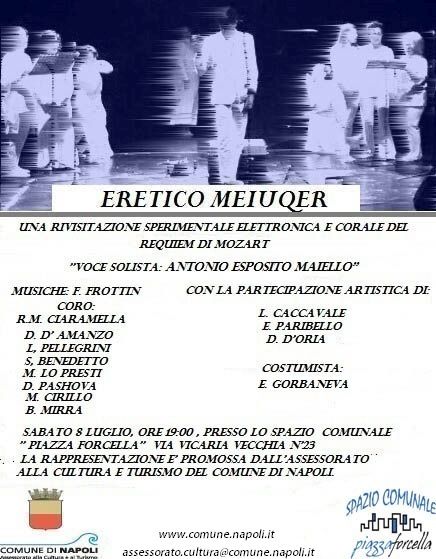 Sabato 8 luglio, alle ore 19.00, presso lo Spazio Comunale "Piazza Forcella" in Via Vicaria Vecchia n. 23, si terrà il concerto "Eretico Meiuqer". La rappresentazione, promossa dall'Assessorato alla Cultura e Turismo del Comune di Napoli, nasce dall'idea di fondere l'esperienza classica corale - con la sperimentazione di suoni elettronici creati con programmi tecnologici - e teatrale - con una visione scenica adattata ai nostri tempi.