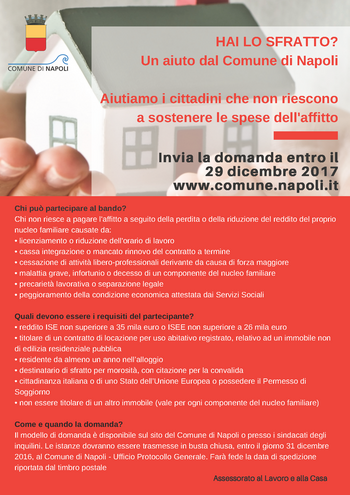 Uno degli obiettivi fondamentali dell'Amministrazione Comunale di Napoli è di alleviare il disagio abitativo dei propri cittadini mettendo in campo strategie e programmi atti a garantire a tutti il diritto ad abitare in una casa dignitosa e adeguata tramite l'applicazione di politiche abitative opportune ed efficienti. A tal riguardo, l'Assessore alle Politiche per la Casa, Enrico Panini, al fine di venire incontro alle esigenze dei soggetti maggiormente colpiti da tale emergenza abitativa, comunica che è attivo un avviso pubblico in merito di notevole interesse dedicato alla "Morosità Incolpevole", finalizzato a fronteggiare la fragilità economica di una fascia di popolazione sempre più ampia che non riesce a sostenere le spese del mantenimento di un alloggio. Il bando per la Morosità Incolpevole, che scade il 29 dicembre 2017, prevede la possibilità, per chi ha uno sfratto, di accedere ai contributi di un fondo pubblico di circa un milione di euro, destinato appunto agli inquilini privati che, per sopravvenute forme di "grave disagio", come la perdita del posto di lavoro, la malattia o il decesso di un componente del nucleo familiare percettore di reddito, sono impossibilitati a provvedere al pagamento dell'affitto della propria casa.