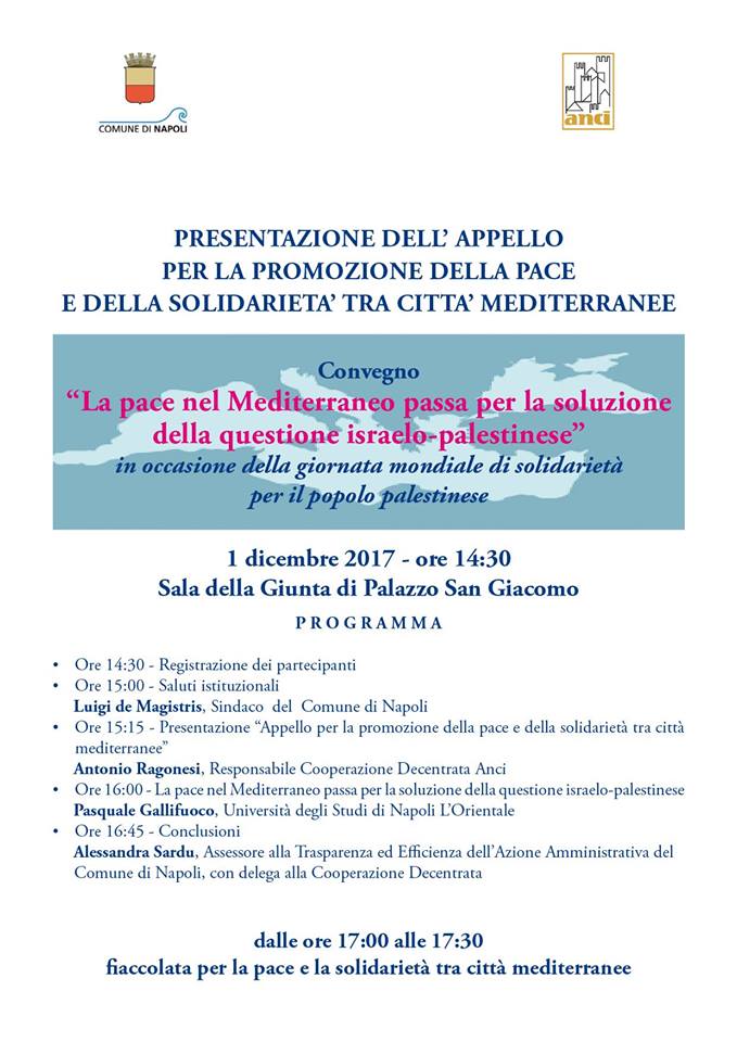 ANCI sceglie Napoli per lanciare l'appello ai Sindaci per la promozione della pace e della solidarietà tra città mediterranee. L'iniziativa viene promossa il 1 dicembre alle ore 14,30 presso la sala della Giunta di Palazzo San Giacomo, in occasione della giornata mondiale di solidarietà per il popolo palestinese. Saranno presenti: Luigi de Magistris, sindaco del Comune di Napoli; Antonio Ragonesi, responsabile Cooperazione Decentrata
