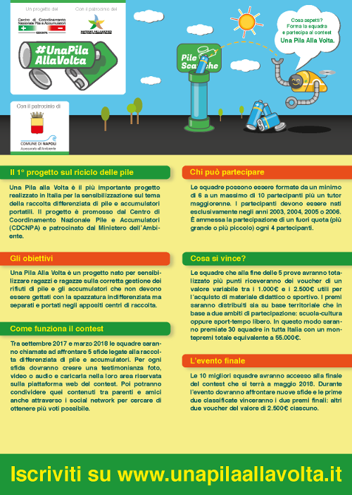 Martedì 19 dicembre 2017, presso la Sala Giunta di Palazzo San Giacomo alle ore 10.00, è stata presentata dal Centro di Coordinamento Nazionale di Pile e Accumulatori la campagna di comunicazione "#Una Pila Alla Volta", patrocinata dal Ministero dell'Ambiente e dal Comune di Napoli e in partenership con UISP- Unione Italiana Sport per Tutti e Civicamente.