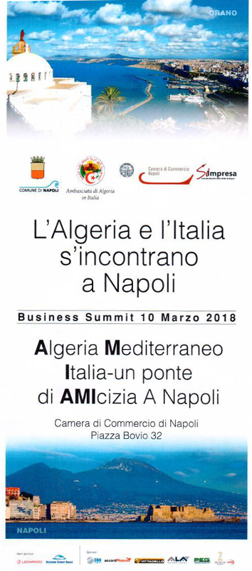 Organizzato dall’ Ambasciata di Algeria in Italia, dal Comune di Napoli e dalla Camera di Commercio di Napoli, il BUSINESS SUMMIT 2018, nell'ambito del mese "L’Italia e l’Algeria s’incontrano a Napoli”, ha l'obiettivo di rafforzare il legame tra i due Paesi nell'approfondimento di tematiche legate agli sviluppi imprenditoriali e al turismo.