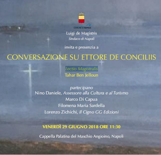 Una lectio magistralis di Tahar Ben Jelloun sull’opera di Ettore De Conciliis si terrà a Napoli, nella Cappella Palatina del Maschio Angioino il prossimo 29 giugno alle ore 11.30. Qui è in corso la mostra “Ettore de Conciliis. Spazi di quiete, paesaggi e land art” che si chiuderà il 26 agosto 2018. Alla lectio magistralis seguirà una conversazione sulla pittura e sulla land art di de Conciliis con il sindaco di Napoli, Luigi De Magistris, l’assessore alla Cultura, Nino Daniele, i curatori della mostra in corso Marco Di Capua e Filomena Maria Sardella, e il presidente de “Il Cigno GG edizioni”, Lorenzo Zichichi.