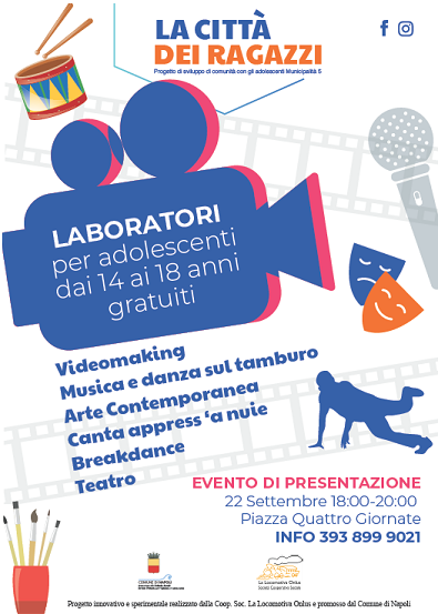Nell’ambito dei Progetti sperimentali e innovativi in favore degli Adolescenti del Comune di Napoli, Assessorato alle Politiche Sociali - Servizio Politiche per l'Infanzia e l'Adolescenza, il giorno 22 settembre dalle ore 18,00 alle ore 20,00 in Piazza Quattro Giornate si terrà l'evento lancio della seconda edizione del progetto “La Città dei Ragazzi”, ideato e realizzato dalla Coop. Soc. La Locomotiva Onlus nell'ambito della 5 Municipalità diretto a sostenere il protagonismo dei ragazzi proponendo esperienze che possano attivare percorsi di trasformazione e di crescita personale e favoriscano la loro espressione attraverso metodologie efficaci a costruire nuove relazioni, modalità comunicative autentiche e processi di partecipazione sociale.