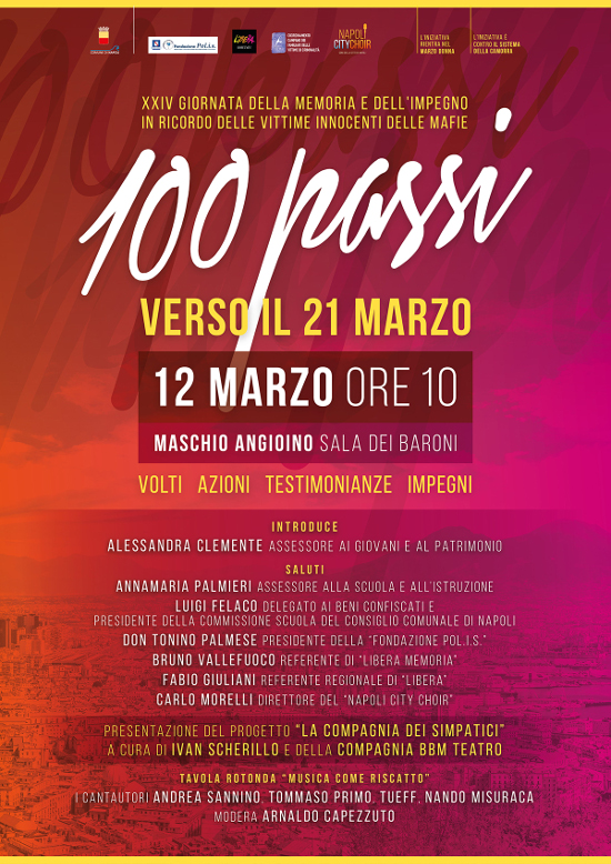 Martedì 12 marzo alle ore 10.00 nella Sala dei Baroni del Maschio Angioino, si terrà l'iniziativa del Comune di Napoli "100 Passi verso il 21 marzo", dedicata alle vittime innocenti di camorra in occasione della "XXIV Giornata nazionale della Memoria e dell'impegno in ricordo delle vittime innocenti delle mafie", giornata riconosciuta con la legge n. 20/2017 che quest'anno, per la Regione Campania, si terrà ad Avellino.