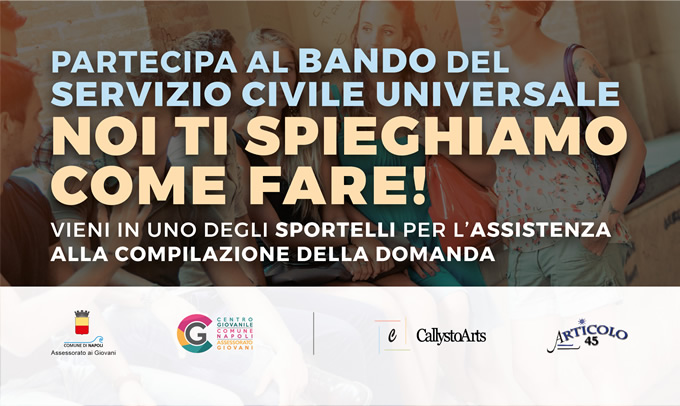 E' on line e in scadenza il 10 ottobre 2019 il Bando di reclutamento di 39.646 volontari su tutto il territorio nazionale.Il Comune di Napoli, in collaborazione con le associazioni Articolo45 e Callysto Arts, ha attivato, all'interno della Rete dei Centri Giovanili tre sportelli di orientamento alla scelta del progetto al quale candidarsi ed accompagnamento alla compilazione della domanda di partecipazione.