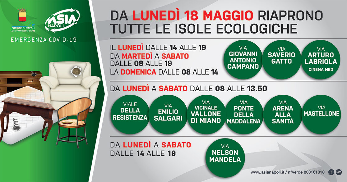 Le Isole ecologiche hanno ripreso il loro servizio a partire da lunedì 18 maggio.Per garantire la sicurezza, Asia Napoli ha definito una serie di regole per l’accesso alle isole ecologiche (di seguito l'immagine con le "Modalità di Accesso"). Gli operatori delle isole ecologiche accoglieranno gli utenti provvisti di tutti i dispositivi di protezione e anche a chi conferisce verrà richiesto di indossare la mascherina. Inoltre sarà consentito di attendere in fila all’esterno rimanendo in auto massimo due persone per auto.