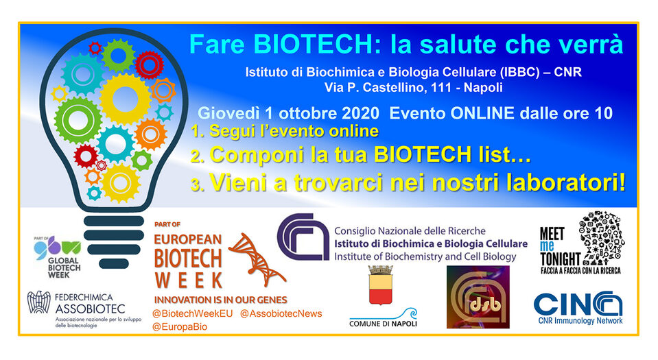 L'evento indirizzato agli studenti della scuola secondaria di 2° grado, agli insegnanti e alle famiglie,celebra la Settimana Europea delle Biotecnologie e fa parte della serie dei pre-eventi della "Notte europea dei ricercatori 2020- MeetMeTonight faccia faccia con la ricerca", con il patrocinio del Dipartimento di Scienze Biomediche del CNR, il network italiano degli immunologi del CNR ed il Comune di Napoli.