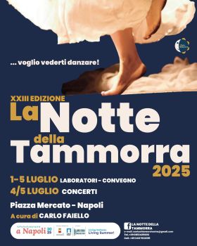 Un evento che esalta il patrimonio artistico e culturale del folk partenopeo, autentico simbolo della musica italiana nel mondo, capace di ispirare generazioni di musicisti e di affascinare un pubblico internazionale con il suo ritmo ancestrale e la sua potenza emotiva. Cinque giorni di musica, danza e cultura, con due serate-concerto, laboratori e un convegno, per celebrare un’arte che vive nel presente guardando alle radici più profonde della tradizione. Un’occasione unica per immergersi nella cultura popolare campana, tra ritmi ipnotici, canti d’amore e di protesta, danze che parlano di libertà. Perché la tammurriata non è solo musica: è l’anima di Napoli che batte nel mondo.