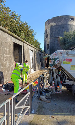 Gli agenti della Polizia Locale dell’Unità Investigativa ambientale ed Emergenze sociali, il personale dei servizi sociali comunali e della Partecipata Asia, hanno effettuato un'attività di bonifica dell'area denominata Torri Aragonesi in via Marina.