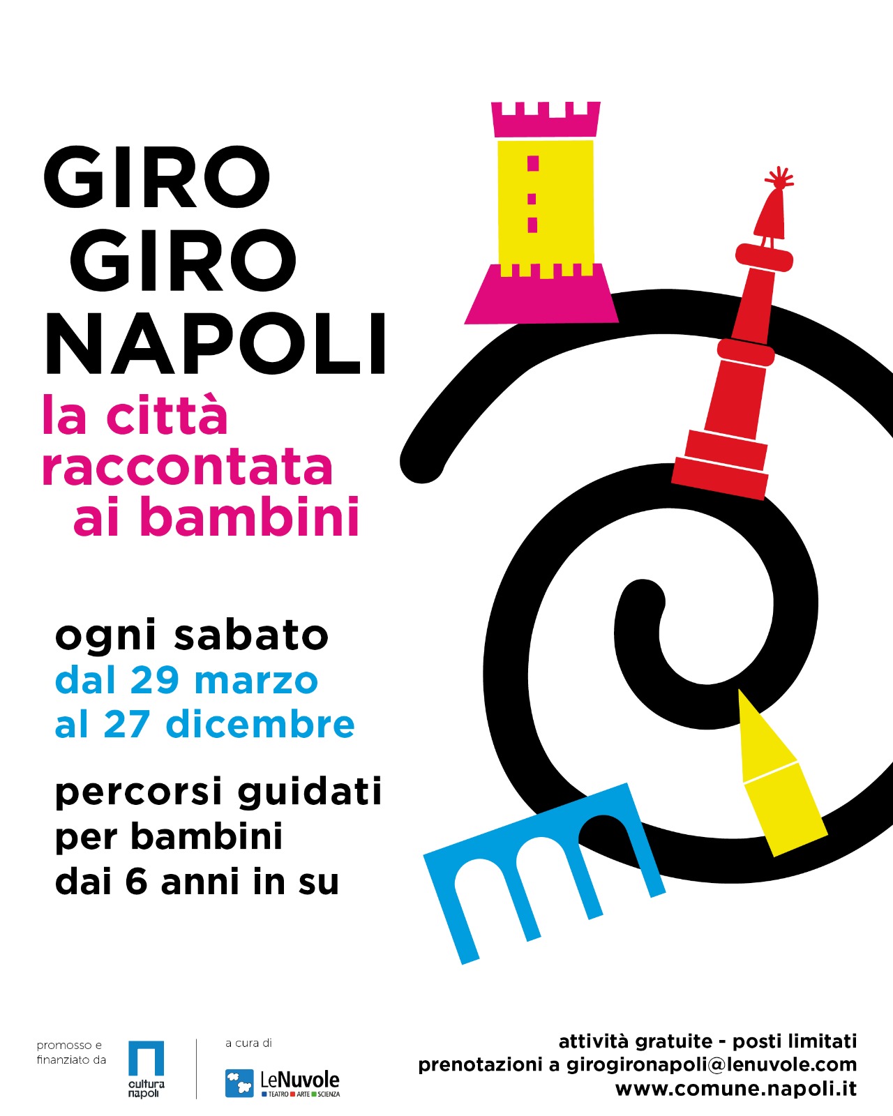 La partecipazione è gratuita fino ad esaurimento posti disponibili, previa prenotazione via email all’indirizzo girogironapoli@lenuvole.com (è possibile prenotare esclusivamente per il mese in corso ed è richiesta l’indicazione dell’età dei partecipanti).